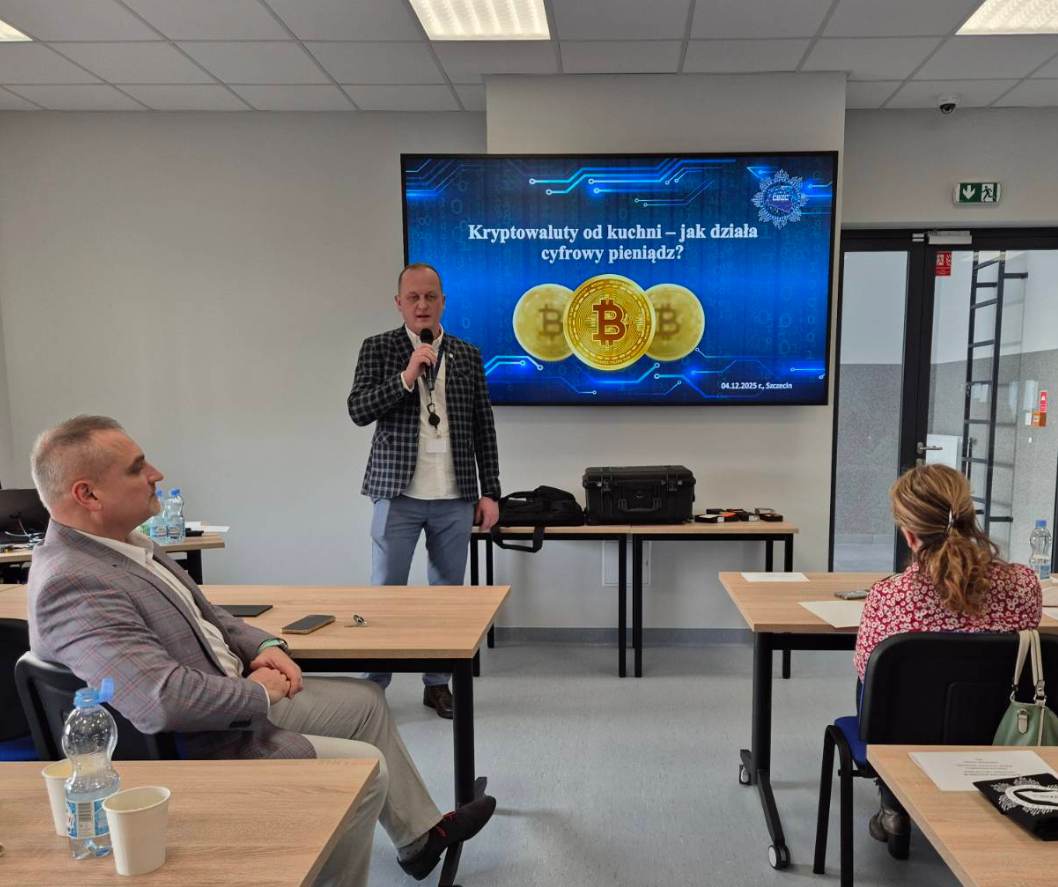 Funkcjonariusz z Zarządu w Szczecinie CBZC omówił temat kryptowalut - formy pieniądza, który funkcjonuje tylko w sieci Internet. Kryptowaluty są legalne w Polsce i nie są traktowane jako „pieniądz”, tylko jako cyfrowy składnik majątku. Policjant przedstawił rodzaje kryptowalut oraz ich nazwy i symbole. W czasie spotkania omówił też, na jakich zasadach działa transakcja kryptowalutowa oraz wytłumaczył, co to jest fraza seed (kluczowy element bezpieczeństwa w portfelach kryptowalutowych - najczęściej zestaw 12, 18 lub 24 słów, który służy do odzyskania portfela kryptowalutowego).