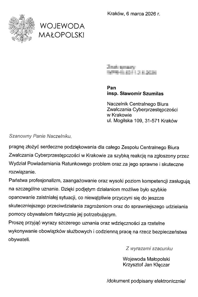 Funkcjonariusze Centralnego Biura Zwalczania Cyberprzestępczości w dwa dni rozwiązali problem, który przez miesiąc męczył służby ratunkowe, angażując ich do fałszywych wyjazdów. Policjanci ustalili pojazd z uszkodzonym systemem eCall, który w ciągu tylko jednego miesiąca wzywał służby ponad 40 razy. Za sprawne działania podziękował Wojewoda Małopolski Pan Krzysztof Jan Klęczar.