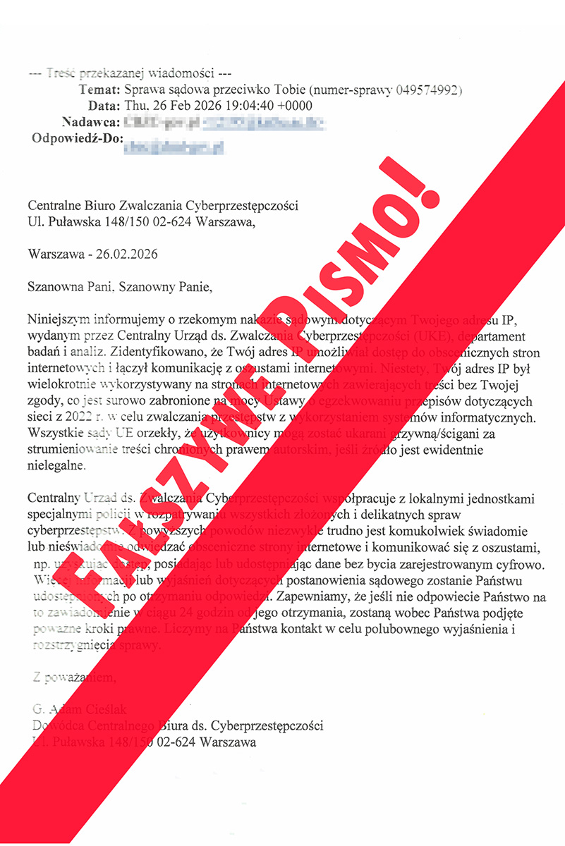 Opisywane maile ZAWIERAJĄ NIEPRAWDZIWE informacje! Policja, CBZC i inne służby policyjne nie są ich autorami.