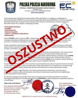W celu uwiarygodnienia swojej wiadomości przestępcy podpisują ją podszywając się pod kierownictwo Polskiej Policji, Centralnego Biura Zwalczania Cyberprzestępczości, Europolu, Interpolu lub innych jednostek Policji.